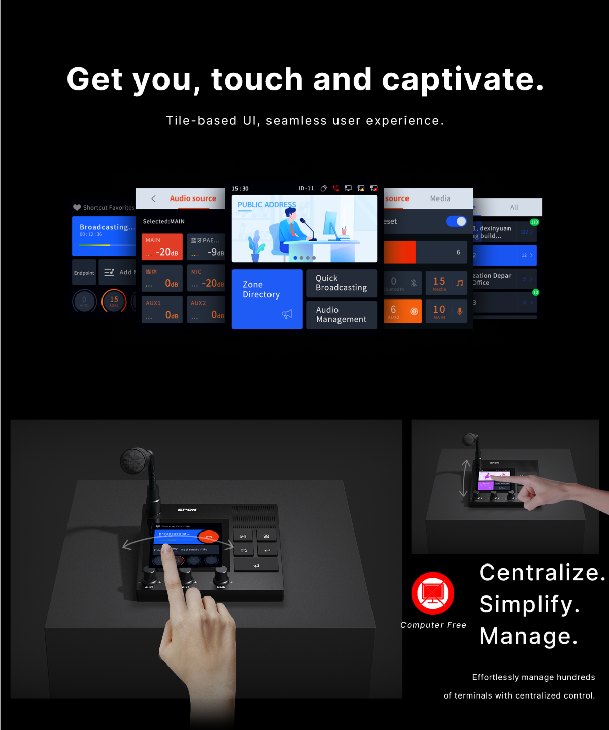 The Network Paging Console with a 4-inch touchscreen, high-quality aluminum alloy panel, and advanced features like zone broadcasting, VoIP integration, and built-in speaker for live communication. Ideal for public address, intercom, and emergency alert systems. Easy to manage and control with the mobile app, offering real-time control and customization.The 4-inch touch display with a resolution of 480x480 ensures easy navigation and clear status visibility for operators.